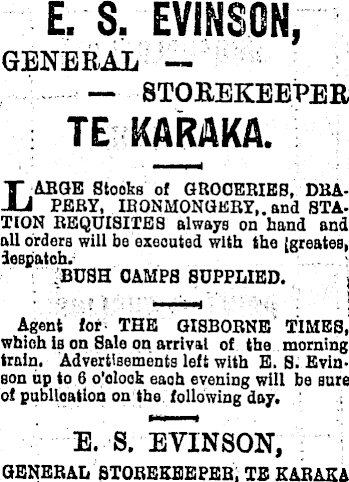 E. S. EVINSON, GENERAL STOREKEEPER TE KARAKA. T ARGE Stooks of GROCERIES, DRAJLI PERY, IRONMONGERY,, and STATION REQUISITES always on hand and all orders will be exeoutod with the [greates, despatch. BUSH CAMPS SUPPLIED. , Agent for THE GISBORNE TIMES, whioh is on Sale on arrival of the morning train. Advertisements left with E. S. Evinson up to 6 o’clock each evening will be sure of publication on the following day. E. S. EVINSON, GENERAL STOREKEEPER, TE KARAKA