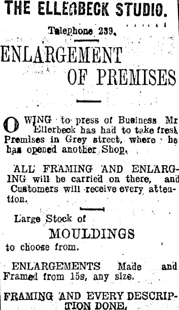 THE ELLEfIBECK STUDIO. Ttlephon* 259, ‘" ‘ ' ENLARGEMENT OE PREMISES OWING to- press of Business Mi Ellerbeok has had to take fresh Premises in Grey street, where - he h_a» opened another Shop, ALL’ FRAMING AND ENLARGING will he carried on there, and Customers will receive every attention. Large Stock of MOULDINGS to choose from. ENLARGEMENTS Made and Framed from 15s, any size. FRAMING AND EVERY DESCRIPTION DONE,