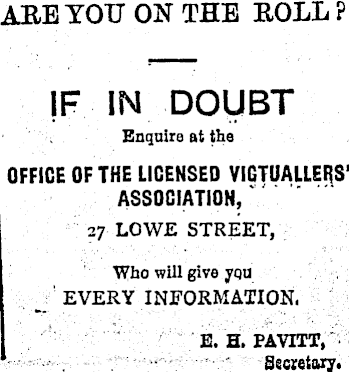 AEE YOE ON THE ROLL ? IF IN DOUBT Enquire at the OFFICE OF THE LICENSED VICTUALLERS’ ASSOCIATION, 27 LOWE STREET, Who will give yqu EVERY INFORMATION. E. H. PAVITT, Secretary.