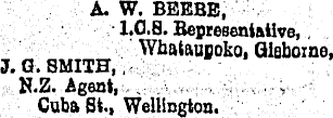 A. W. BEEBE, 1.0.5. Bepresentatlve, Whataupoko, Qlaboxne, 3. G. SMITH,, N.Z. Agent, Cuba St., Wellington.