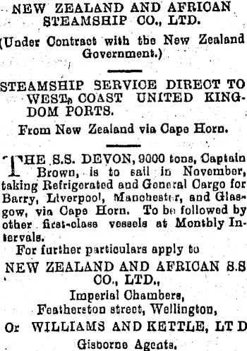 NEW ZEALAND AND AFRICAN STEAMSHIP CO., LTD. (Under Oontraot with the New Zealand Government.) ' ' " : 1 __ STEAMSHIP SERVICE DIRECT TO WESTfI COAST UNITED KINGDOM PORTB. From New Zealand via Cape Horn. ••pHE ,S.S. DEVON, 9000 tone, Captain 1- Brown, ia to sail in November, taking Refrigerated and General Cargo for Barry, Liverpool, Manchester, and Glas» gow, via Cape Horn. To bn followed by other firat-'olass vessels at Monthly Intervals. For farther particulars apply to NEW ZEALAND AND AFRICAN S.S ‘ CO„ LTD., Imperial Chambers, Foathereton street, Wellington, Or WILLIAMS AND KETTLE, LTD Gisborne Ageats.
