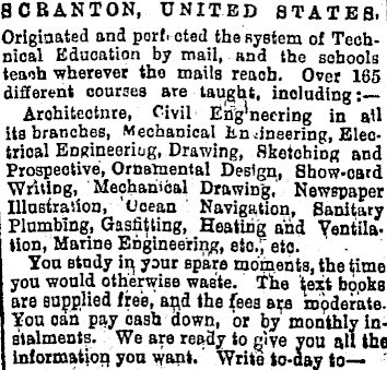 BCBANTON, UNITED STATES. Originated and port, cted the Bystem of Technical Education by mail, and the schools teach wherever the mails reaoh. Over 165 different courses are taught, including: Architecture, Civil En’g ! necring in all i its branches, Mechanical tn dneering, Electrical Engineering, Drawing, Skotohing and Prospective, Ornamental Design, Show-oard ■Writing, ' Mechariioal Drawing, Newspaper Illustration, 'Ucean Navigation, Sanitary Plumbing, Gasfitting, Heating and Ventilation, Marine Engineering, eto.; eto. You study iq your spare moments, the time you would otherwise waste. T!he text books are supplied free, arid the fees are moderate. You can pay cash down, or by monthly instalments. We are ready to give you all the information you want,' Write to-day to—