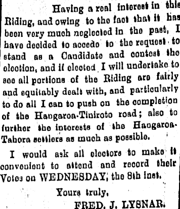 Having a real interest in this Biding, and owing to tho loot that it has boon very muoh nogloolod in tho past, I have dooided to aooedo to tho request ■ to stand as a Candidate and oontoat tho olootion, and i( olootod, I will undertake to boo all portions of tho Biding oro fairly and equitably dealt with, and particularly 1 to do ail I can to push on tho completion of tho Hangaroa-Tiniroto road; also to further tho interests of tho HaogaroaVahora settlors as muoh as possible, I would ask all oleotora to make it oonvouiont to attond and record their Volos on WEDNEBDAY, tho Bth inst. Yours truly, FRED. J. LYSNAR.