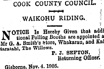 GOOK COUNTY COUNCIL, WAIKOHU RIDING. NOTIOE la Hereby Given that addi tional Polling Booths are appointed ai Mr G, A. Smith’s (store, Whakarau, and fiat taratohl, The Willows. P. J. SEFTON, l Returning Offlaor. Gisborne, Nov. 4.1005.