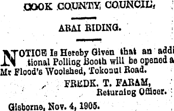 | COOK .COUNTY COUNCIL’, ARAI BIDING. NOTICE la Hereby Given that an addi tional Polling Booth will be opened al Mr Flood's Woolehed, Tokoaut Road. FREDK. T. FARAM, Returning Officer. Gisborne, Nov. 4,1905.
