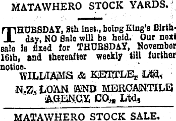 MATAWHERO STOCK YARDS. THURSDAY, Bth inßt., being King’s Birthday, MO Sale will be held. Our next sale is fixed for THURSDAY, November 16th, and thereafter weekly till further notioe. WILLIAMS & REnrrLE* iU<L N.2. LOAN AND MERCANTILE ' AGENCY. COju !M.i MATAWHERO STOCK SALE.