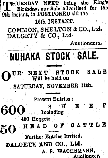 mHURSDAY NEXT, being the King's JL Birthday, our Sale advertised lor the 9lh instant* is POSTPONED till the 16th INSTANT. COMMON, SHELTON & CO., Ltd, DALGETY & CO., LtdAuctioneers. NUHAKA STOCK SALE. O UR NEXT STOCK SALE Will be held on SATURDAY, NOVEMBER 11th, Present Entries; /i/\rv SHE E P OUU . Including 400 Hoggets HEAD OF CATTLE Further Entries luvited. DALGETY AND CO., Lti. A. 8. WAOHSSUNN, Auctioneer.
