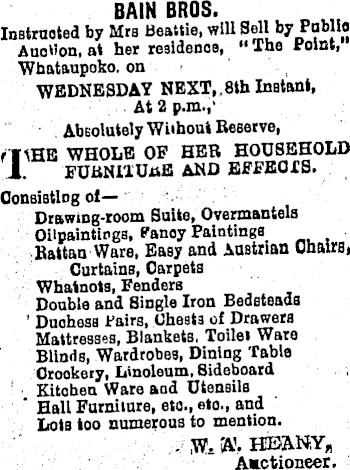 BAIN BROS. Instructed by Mrs Beattie, will Sell by Public Auction, at her residence, “The Point, Wbataupoko. on WEDNESDAY NEXT,. Bth Instant, At 2 p.m.,' Absolutely Without Reserve, rItHE WHOLE OF HER HOUSEHOLD 1. FURNITURE AND EFFECTS. Consisting of— Drawing-room Suite, Overmantels Oilpaintings, Kanoy Paintings Rattan Ware, Easy and Austrian Chairs, Curtainß, Carpets Whatnots, Fenders Double and Single Iron Bedsteads ’ Duchess Pairs, (Jheata of Drawers Mattresses, Blankets. Toilet Ware Blinds, Wardrobes, Dining Table Crockery, Linoleum, Bideboard Kitchen Ware acd Utensils Hall Furniture, etc., etc., and Lots too numerous to mention, ,W* r A'. HBAN.Y, Auctioneer.