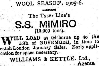 WOOL SEASON, 1905*6. The Tyser Line's S.S. MIMIRO (10,000 tons). WLL LOAD at Gisborne up to the 15th of NOVEMBUtt, in time to oatoh London January Sales. Early application lor spaoe neoessary. WILLIAMS A KETTLE. Ltd., Agents.