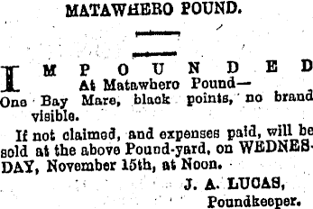 MATAWHERO FOUND. IMP OUN D ED At Matawhero PoundOne Bay Mare, bluok points, no brand visible. If not claimed, and expenses paid, will be Bold at the above Pound-yard, on WEDNESDAY, November 15th, at Noon. J. A. LUCAS, Poundkeeper.