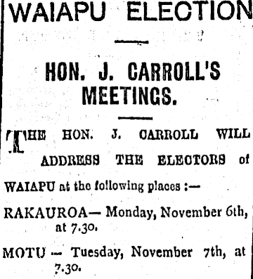 WAIAPU ELECTION HON. J. CARROLL’S MEETINGS. HON. J. CARROLL WILL ADDRESS THE ELECTORS of WAIAPU at tho following plaoos RAKAUROA— Monday, November 6th, at 7.30. MOTU Tuesday, November 7th, at 7-3 0<