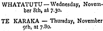 WHATATUTU Wednesday, November Bth, at 7.30. TE KARAKA Thursday, November 9th, at 7.80.