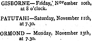 | GISBORNE- Friday,', November iotb, at 8 o’clock. PATUTAHl—Saturday, November nth, at 7-3°-ORMOND Monday, November 13th, at 7'3 a