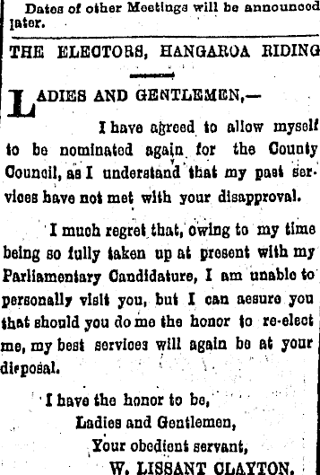 Dates of other Meetings will bo onnounood later. THE ELECTORS, HANGAROA BIDING AND GENTLEMEN, — I have agreed to allow mysell to be nominated again for the County Counail, asl understand that my past services have not met with your disapproval. I muoh regret that, owing to my time being so fully taken up at present with my Parliamentary Candidature, I am unablo to personally visit you, but I can aesura you that should you do mo the honor to re-eleot me, my best services will again be at your disposal. I have the honor to be, Ladies and Gentlemen, Your obedient servant, W. LISSANT CLAYTON.