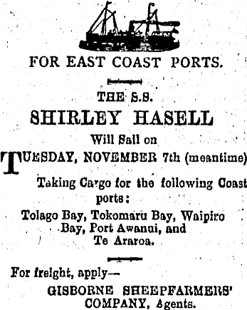 FOR EAST COAST PORTS. THES.B. SHIRLEY HASELL Will Bail on rpUHSDAY, NOVEMBER 7th (meantime) Taking Cargo for the following Coast ports: Tolago Bay, Tokomarii Bay, Waipii.'o Bay, Fort Awanni, and Te Araroa. For freight, apply— GISBORNE SHEEPFARMERS’ COMPANY, Agents.