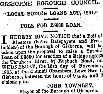 GISBORNE BOROUGH COUNCIL. “LOCAL BODIES LOANS ACT, 1901." POLL FOB £5500 LOAN. I HEREBY GIVt; NOTICE that a Poll of Kleotora (be'n* Ratepayers and Freeholder?) of the Borough of Gisborne, will be taken upon the proposal to raise a Special Loan of £5500 for erection of a Bridge across thoTaruheru Biver, at Roebuck Road, on WEDNESDAY, the 15th day of November, 1905, at ihe Council Oh ambers, Lowe Street, Gißborne, between the hours of 9 a.m. and 7 o’clock p.m. _ o oiooa a j O HN TOWNLEy( Mayor of the Borough of Gisborne.