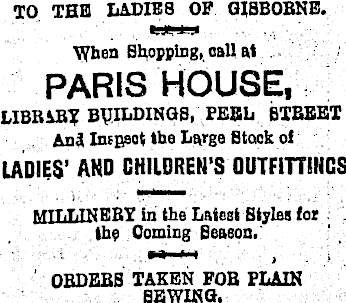 TO THE LADIES OF GIBBQBNE. When Shopping, call at PARIS HOUSE, LIBBiB? BUILDINGS, PEEL BTEEET Au 4 InEpaot the Large Stock oi LADIES’ AND CHILDREN’S OUTFITTINCS MILLINER? in the Latest Styles for the Coming Season. ORDERS TAKEN FOB PLAIN SEWING.