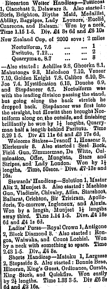 Rlooarton Welter Handioap—Petticoat 1, Olanohatt 2, Delaware 8. Also started : Boris, Brighton, Blytho Maid, Medallist, Ability, Bagpipes, Lady Lyonars, 'Euolia, Ozareona, and Balaam. Won by a nook. Timo 1.15 1-5. Div. £4 8a 63 and £6 10a Now Zealand Oup, of 2000 aova; 2 miles Nootuiform, 7.6 1 Paritutu, 7.12 ‘-5 Quarryman, 8.7 8 —Also started: Achilles 9.8, Ghoorka 8.1, Mahutonga 9.8, Moloduon 7.10, Vonoer 7.10, Golden Knight 7.8, Oalibro 6.10, St. I Jog 7.4, Mystification 6.18, Douohe 6.9, | and Stepdanoor 6.7. Nootuiform wbs with tho loading division passing the stand, but goiDg along tho baok strotoh. ho dropped book. Stopdanoer was first into tho straight, but Howitt thon brought Nootuiform along on. tho outside, and finishing brilliantly ho won by 1£ lengths, Quarryman half a length behind Paritutu. Timo 8.29 15. Div £1 lls 6d and £3 17s 6d, Welcome Stakes—lvanoff 1, Huascar 2, I Kirriemuir 8. Also started: Seal Bock, Fiold Gun, Zimmerman, Do Witte, Culmination, Offer, Mungista, Stare and Stripes, and Lady London. Won by 1* lengths. Timo, 60seos, 1 Divs. £7'l3s and 16s. . ._, . I Stewards* Handicap—Solution Master I Alix 2, Munjeet 3. Also started: Maohine Gun, Vladimir, Chivalry, Aifsa, Starshoot, Ballarat, Crichton, Sir Tristram, Apollodoris, To-morrow, Inglenoux, and Aloxis. Won by a length, Munjßet It lengths I away third. Time 1.14 1-5. Divs. £4 16s 6d and £4 Is 6d. Ladies’ Parse—Royal Crown 1, Antigono 12, Blaok Diamond 8. Also started : Bongoa, Waiwaka, and Count Loohiel. Won by a neok with something to spare. Timo 2.431-5. Div., £4 Bs. Shorts Handicap—Matuku 1, Largesse 2, Stepaside 3. Also started: Bonnie Brae, I Hinerau, King’s Guest, Ordinance, Curate, King Stork, and Quiokfire. Won easily by 2} lengths. Time 1.88 3-5. Div £6 8s 6d and £2 16s.