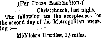 (Per Press 'Association.)' Ohristohurch, last night. The following ore the acoeptanoes for the second day Of the Metropolitan meeting : Middleton Hurdles, 1£ miles.