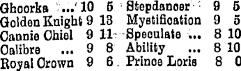 Ghoorka ... 10 5 Stepdanoer 9 5 Golden Knight 9 13 Mystifioation 9 5 Cannie Chiel 9 11 Speculate ... 8 10 Calibre ... 9 8 Ability ... 810 Royal Crown 9 6 Prince Loris 8 0