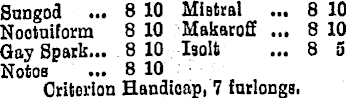Sungod ... 810 Mißtral ... 810 Nootuiform 810 Makaroff ... 810 Gay Spark... 8 10 Isolt ... 8 5 Notos ... 8 10 Criterion Handioap, 7 furlongs.