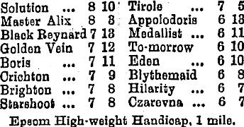 Solution ... 8 10 Tirole ... 7 5 Master Alix 8 8 Appolodoris 613 Blaok Reynard 713 Medallist ... 6 11 Golden Vein 712 To-morrow 610 Boris ... 7 11 Eden ... 610 Oriohton ... 7 9 Blythemaid 6 8 Brighton ... 7 8 Hilarity ... 6 7 Starshoot ... 7 8 Czarevna ... 6 7 Epsom High-weight Handioap, 1 mile.