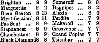 Brighton ... 9 9 Somarofi ... 8 8 Marguerite 9 2 Bagpipes ... 8 2 Beau Seaton 8 18 Alexia ... 8 0 Mystifioation .8 11 Perdita ... 7 9 PaaSeul ... 8 9- Makaroff ... 7 9 Btepdancer 8 9 Groavenor... 7 7 Olanohattan 8 9 Grand Poplar 7 7 BlaokDiamondß 8 Tsitaihar ... 7 7