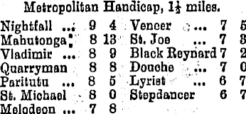 Metropolitan Handicap, 1£ miles. Nightfall ... 9 4 Venoer ... 7 6 Mahutonga' 818 St. Joe ... 7 8 Vladimir ... 8 9 Black Reynard 7 2 Qaarryman 8 8 Douche ... 7 0 Paritutu ... 8 5 Lyrist ... 6 7 St, Michael 8 0 Btepdancer 6 7 Melodeon ... 7 8