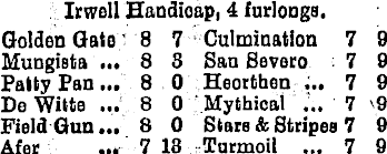 Irwell Handicap, 4 furlongs. Golden Gate 8 7 Culmination 7 9 Mungiata ... 8 3 Sau Severo 7 9 Patty Pan... 8 0 Heorthen ... 7 9 De Witte ... 8 0 Mythioal ... 7 9 Field Gun... 8 0 Stare & Stripes 7 9 Afer ... 718 Turmoil ... 7 9