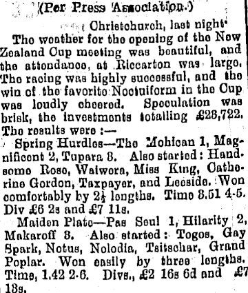 [(Per Press ABiiocda'tfpo.) t Ohristohnroh, last night* Tho woather for tho opening of tho Now Zealand Oup mooting was boautiful. and tho attendance. at Rioearton was largo. Tho raoing waa highly auoooaafnl, and tho win of tho favorito Nootuiform in tho Oup waa loudly ohoorod. Speculation waa brisk, tho invoatmonta totalling *628,722. Tho roaulta wore : Spring Hurdloa—Tho Mohioan 1, Magnifloont 2, Tupara 8. Also startod: Hand, aomo Rose, Walworo, Mias King, Oathorino Gordon, Taxpayer, and Looßido. Won oomfortably by 2} longtha. Timo 8,81 4-5. Div £6 2s and £7 11a. Maiden Plato—Pas Soul 1, Hilarity 2, Mnkarofl 8. Alao started: Togos, Gay Spark, Notua, Nolodia, Taitaohar, Grand Poplar. Won onaily by tbroo longtha. Time, 1.42 2-6. Diva., £2 16a 6d and £1 18a.