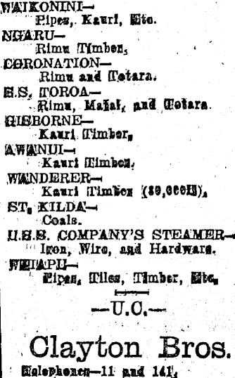 JJ'A'IKONINIElpes, Kauri, mto. EJKARU— Rimu I'nmben, ESRONATIONRimu and (Totarji. B.S, [TOROA- ■ Rim®, Malal, pjad HeUr®. OIBBORNEKaixl (Timfeer, AWBSNHI-i Kasrl (Ilmtov ,WaiNDERER-H Kauri il’im’ScE '(89,06013);, B.T, KILttK-i U.BM. /COMPANY’S STEAMER-. Icon, .Wire, &Rd Hardware. J7EIAPII- ' Eiptfl, [Tiles, TSmfecr, —tj.o.~ Olayton Bros. HnlePianto—ll and ldlj