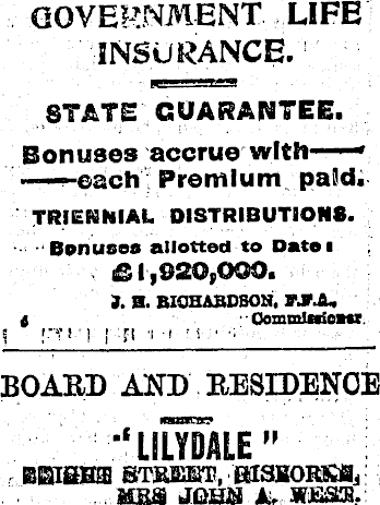 GOVERNMENT LIFE INSURANCE. STATE GUARANTEE. Bonuses accrue with— —each Premium paid. TRIENNIAL DISTRIBUTIONS. Bonuses allotted to Date i £1,920,000. J. B. BICHABDBON, SUVA, t OommlHioMZ 5 !i i ; n i ■! m ■ ■■ BOARD AND RESIDENCE LILYDALE ” BEUBHJE BTEffiET. aiSBORBtfi, MRS JQHS Jkr WES 33-