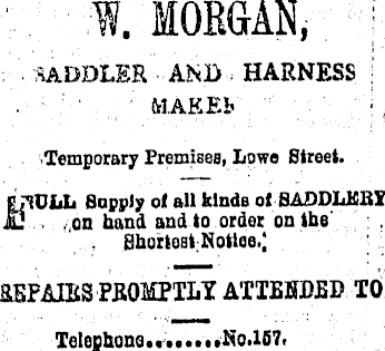 V. MORGAN, SADDLER and harness MAKER Temporary Premises, Lowe Street. RiIULL Supply of all kinds of SADDLKBX •JQ .on hand and to order on the BhortostNotlee.) RBPAIBS PROMPTLY ATTENDED TO Telephone. .*•.... .K 0.167.