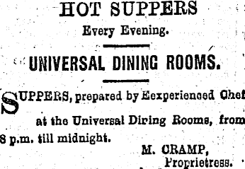 HOT SUPPERS Every Evening. UNIVERSAL DINING ROOMS. QPPPERS. prepared by Kexperienoed Ghel at the Universal Dining Booms, from 3 p.m. till midnight. M. CRAMP, Proprietress. •