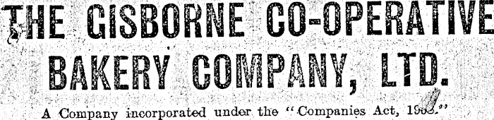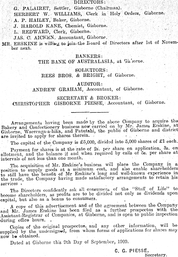 DIRECTORS: G. PALAIRET, Settler, Gisborne (Chairman). HERBERT W. WILLIAMS, Clerk in Holy Orders, Gisborne. A. P- HAILEY, Baker, Gisborne. ,J. HAROLD KANE, Chemist, Gisborne. L. RED WARD, Clerk, Gisborne. JAS. C. AICKEN. Accountant, Gisborne. MR. ERSKINE is willing to join. the Board of Directors after Ist of November next. BANKERS: THE BANK OF AUSTRALASIA, at Sis Woe. SOLICITORS: REES BROS. & BRIGHT, of Gisborne. AUDITOR: ANDREW GRAHAM, Accountant, of Gisborne. SECRETARY & BROKER: CHRISTO!’HER GISBORNE PIESSE, Accountant, of Gisborne. Arrangements having been raado by the above Company to acquire the Bakery and Confectionery business now carried on by Mr. James Erskme, at Gisborne, Waerenga-a-hika, and Patutahi, the public of Gisborne and district are- invited to- apply for shares therein. The capital of the Company is £5,000, divided into 5,000 shares of £1 each. Payment for shares is at the rate of 2s. per share on application, 3s. on allotment, and the balance if and when required by calls of ss. per share at intervals of not less than one month. The acquisition of Mr. Erskine \s business will place the Company in a position to supply goods at a minimum cost, and also enable shareholders to still have the‘benefit of Mr Erskine’s long and well-known experience m the trade, the Company having made satisfactory arrangements to retain his services l The Directors confidently ask all consumers of the "Staff of Life” to become shareholders, as profits are to be divided not only as dividends upon capital, but also as a bonus to consumers, A copy of this advertisement and of the agreement between the Company and Mr. James Erskine has been filed as a further prospectus with the Assistant-Registrar of Companies, at Gisborne, and is open to public inspection during office hours. , Copies of the original prospectus, and any other information, will be supplied by the undersigned, from whom forms of applications for shares may now be obtained. Dated at Gisborne this 9th Day of September, 1909. C. G. PIESSE, Secretary.