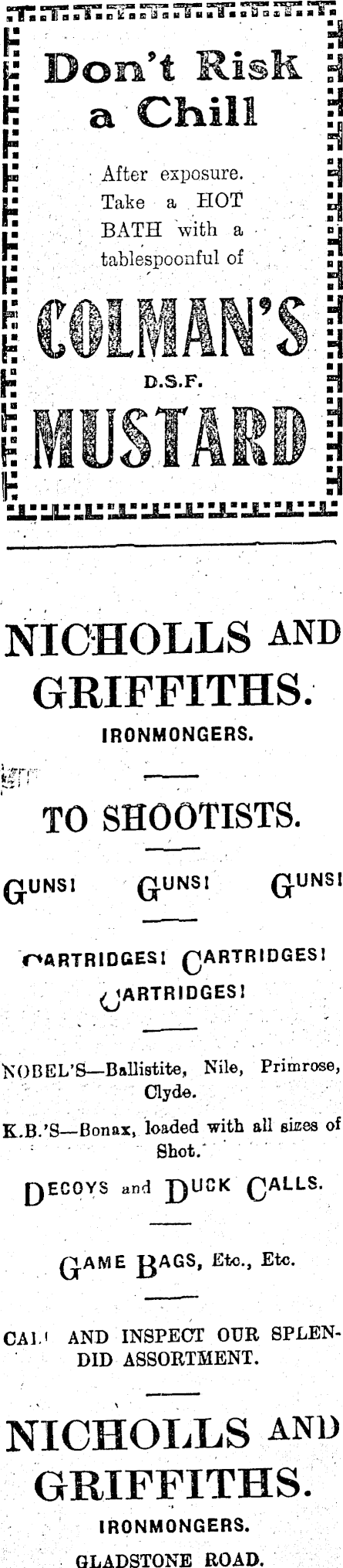 nr; zr. tt. rs; m w. rn rn rr: H K K a H JP After exposure. BJj Take a HOT p BATH with a “ tablespoonful of h K B.S.F. BBBIIUBBIIBBRiBB NICHOLLS and GRIFFITHS. IRONMONGERS. TO SHOOTISTS. Q.UNSI Q.UNSI Q-UNSI CARTRIDGES! QARTRIDGESI CARTRIDGES! NOBEL’S —Ballistite, Nile, Primrose, Clyde. K.B.’S—Bonax, loaded with all of Shot. QECOYS and J)UCK QALLS. QAME gAGS, Etc., Etc. CAL' AND INSPECT OUR SPLENDID ASSORTMENT. NICHOLLS and GRIFFITHS. IRONMONGERS. GLADSTONE ROAD. i coEin rgsrera s=zk!a wuSkai tseSsn egjasn