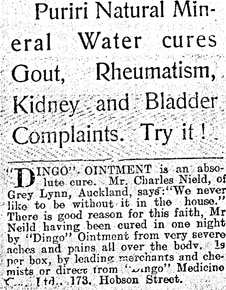 Puriri Natural Mineral Water cures Gout, Rheumatism, Kidney and Bladder Complaints. Try it! . kINGO” OINTMENT is an absojl J lute cure. Mr. Charles Nield, of Grey Lynn, Auckland, says:“We never like' to be without it in the house. There is good reason for this faith,. Mr Neild having been cured in one night bv “Dingo” Ointment from very severe aches and pains all over the bodv. Is per box, by leading mercnants and chemists or direct trom ‘‘xyingo” Medicine r,„. ltd.. 173, Hobson Street.