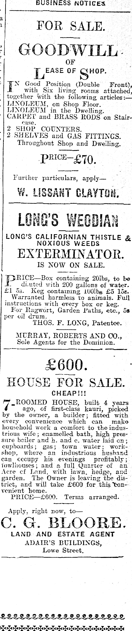 BUSINESS NOTICES FOR HALE. GOODWILL • OF JjEase of y hop. IX Good Position (Double Front), with_ Six living rooms attached, together with the following articles:— LINOLEUM, on Shop Floor. LINOLEUM in the Dwelling. CARPET and BRASS RODS on Stairease. 2 SHOP COUNTERS. 2 SHELVES and GAS FITTINGS. Throughout Shop and Dwelling. P-^7O. Further particulars, apply— W. LiSSAHT CLAYTON. LONG’S CALIFORNIAN THISTLE A NOXIOUS WEEDS EXTERMINATOR. IS NOW ON SALE. PRICE —Box containing 20Ibs, to be _ di.uted with 200 gallons of water. Li os. Keg containing iOOI be £5 15a. Warranted harmless to animals. Full instructions with every box or keg. Tor Ragwort, Garden Paths, etc., 5s per oil drum. THOS. F. LONG, Patentee. MURRAY, ROBERTS AND CO., Sole Agents for the Dominion. £6OO. HOUSE FOR SALE. CHEAP!!! fT_ROOMED HOUSE, built 4 years s ago, of first-class kauri, picked by the owner, a builder; fitted with, every convenience which can make household work a comfort to the industrious wife ; enamelled bath, high pressure boiler and h. and e. water laid on ; cupboards; gas; town waier; ’workshop, where an industrious husband can occupy his evenings profitably; fowlhouses; and a full Quarter of an. Acre cf Land, with lawn, hedge, and garden. The Owner is leaving the district, and will take £6OO for this ’Convenient home. PRICE —£600. Terms arranged. Apply, right now. to— C. G. BLOGRE. LAND AND ESTATE AGENT ADAIR’S BUILDINGS, Lowe Street. *s* ►J* iji ij* >j» *s*