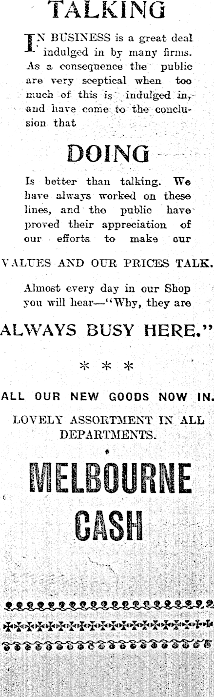 TALKING TX BUSINESS is a great deal indulged in by many firms. As a consequence the public are very sceptical when too much of this is indulged in, and have come to the conclusion that DOING Is better than talking. We have always worked on these lines, and the public have proved their appreciation of our efforts to make our VALUES AND OUR PRICES TALK. Almost every day in our Shop you will hear—“ Why, they are ALWAYS BUSY HERE.” V ALL OUR NEW GOODS NOW IN. LOVELY ASSORTMENT IN ALL DEPARTMENTS. MELBOURNE GASH