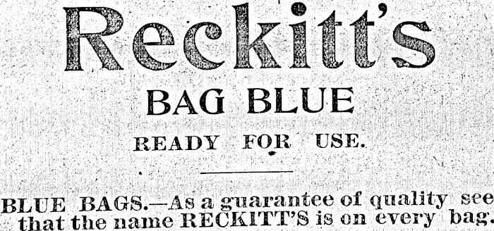 BAG BLUE READY FOR USE. BLUE BAGS.— As a guarantee of quality see that the name RECKITT’S is on every hag.