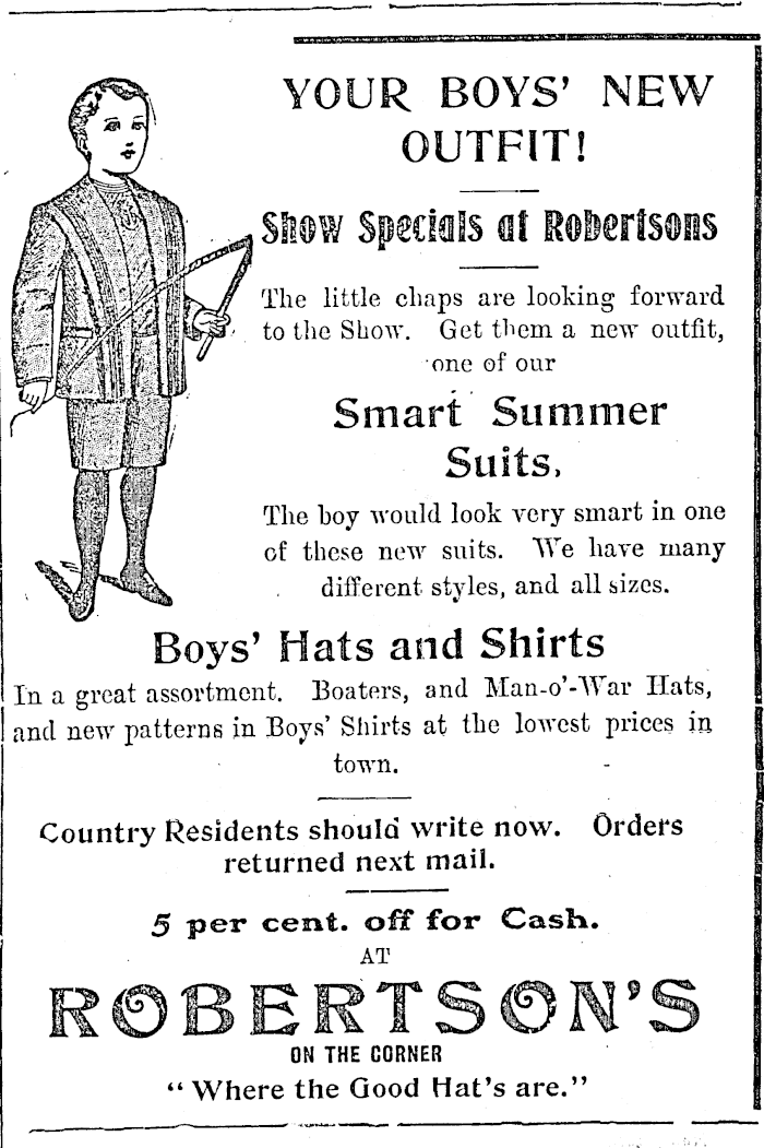 YOUR BOYS’ NEW OUTFIT! s snow Specials of Ro&ertsoiis The little chaps are looking forward to the Show. Get them a new outfit, one of our Smart Summer Suits, The boy would look very smart in one of these new suits. We have many different styles, and all sizes. Boys’ Hats and Shirts In a great assortment. Boaters, and Man-o-TVar Hats, and new patterns in Boys’ Shirts at the lowest prices in, town. Country Residents should write now. Orders returned next mail. 5 per cent, off for CasH. AT ROBERTSON'S ON THE CORNER “ Where the Good Hat’s are.”