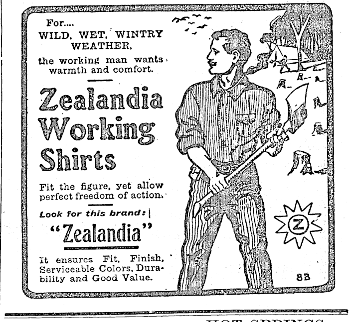 (jf F0r.... WILD. WET. WINTRY WEATHER. the working man want 3 warmth and comfort. Zealawdla Working Shirts Fit the figure, yet allow perfect freedom of action. Look for this brand: j Zealandia” <6 It ensures Fit, Finish, Serviceable Colors. Durability and Good Value. M n z 8B tt rv m