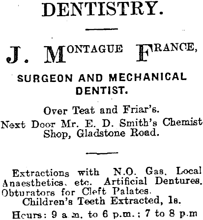 DENTISTRY J. M ONTAGTJE JpRANOE, SURGEON AND MECHANICAL DENTIST. Over Teat and Friar’s. Next Door Mr. E. D. Smith’s Chemist Shop, Gladstone Road. Extractions ■with N.O._ Gas. Local Anaesthetics, etc. Artificial Dentures. Obturators for Cleft Palates. Children’s Teeth Extracted, Is. Hours: 9 a in. to 6 p.m.; 7to 8 p m