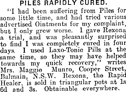 PILES RAPIDLY CURED. “I had been suffering from Piles for some little time, and had tried various advertised Ointments for my complaint, but I only grew worse. 1 gave Rexona a trial, and was pleasantly surprised to find I was completely cured in four days. I used Laxo-Tonic Pills at the same time, so they may have helped towards my quick recovery,” writes Mrs. Maggie Munro, Cooper Street, Balmain, N.S.W. Rexona, the Rapid Healer, is sold in triangular pots at Is 6d and 3s. Obtainable everywhere.
