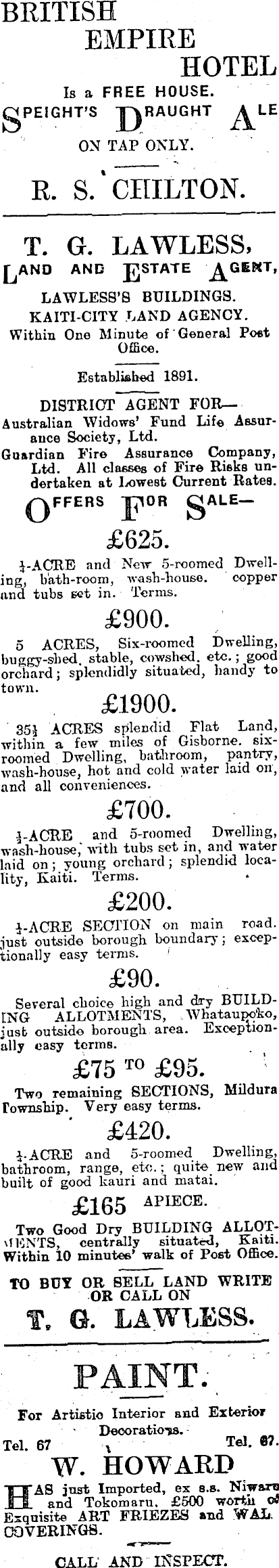 BRITISH EMPIRE HOTEL Is a FREE HOUSE. gPEIGHT’S JQRAUGHT ON TAP ONLY. LE R. S.' CHILTON. T. G. LAWLESS, AND STATE LAWLESS’S BUILDINGS. KAITI-CITY LAND AGENCY. Within One Minute of Genera] Poet Office. Established 1891. DISTRICT AGENT FORAustralian Widows’ Fund Life Assurance Society, Ltd. Guardian Fire Assurance Company, Ltd. All classes of Fire Risks undertaken at Lowest Current Rates. QFFERS F OR SAL$ ALE ~ £625. l-ACRE and New 5-roomed Dwelling, bath-room, wash-house. copper and tubs set in. Terms. £9OO. 5 ACRES, Six-roomed Dwelling, buggy-shed, stable, cowshed, etc.; good orchard; splendidly situated, hand}’ to town. £I9OO. 351 ACRES splendid Flat Land, within a few miles of Gisborne, sixroomed Dwelling, bathroom, pantry, wash-house, hot and cold water laid on, and all conveniences. £7OO. i-ACRE and 5-roomed Dwelling, wash-house,' with tubs set in, and water laid on ; young orchard ; splendid locality, Kaiti. Terms. £2OO. i-ACRE SECTION on main road, just outside borough boundary; exceptionally easy terms. £9O. Several choice high and dry BUILDING ALLOTMENTS, Whataupoko, just outside borough area. Exceptionally easy terms. £75 T 0 £95. Two remaining SECTIONS, Mildura Township. Very easy terms. £420. i-ACRE and 5-roomed Dwelling, bathroom, range, etc.; quite new and built of good kauri and matai. £165 APIECE - Two Good Dry BUILDING ALLOTMENTS, centrally situated, Kaiti. Within 10 minutes’ walk of Poet Office. TO BUY OR SELL LAND WRITE OR CALL ON T. G. LAWLESS. PAINT. For Artistio Interior and Exterior DecoratioTis. Tel. 67 v ' Tel - 07 • W. HOWARD HAS just Imported, ex s.s. Niwam and Tokomaru. £SOO worth oi Exquisite ART FRIEZES and WAL. COVERINGS. CALL AND INSPECT.