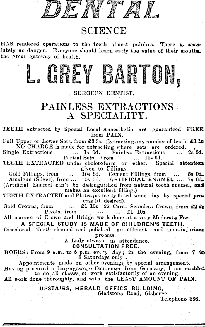 DENTAL SCIENCE HAS rendered operations to the teeth almost painless. There ie absolutely no danger. Everyone should learn early the value of their moutha. the preat gateway of health L. GREY BARTON, , SURGEON! DENTIST. PAINLESS EXTRACTIONS A SPECIALITY. TEETH extracted by Special Local Anaesthetic ar* guaranteed FREE from PAIN. Full Upper or Lower Sets, from £3 3s. Extracting any number of teeth £1 Is NO CHARGE is made for extracting where sets are ordered. , Single Extractions ... Is Od. Painless Extractions ... 2s Bd. Partial Sets, from ... 15s Od. TEETH EXTRACTED under choloroform or ether. Special attention given to Fillings. Gold Fillings, from ... IDs 6d. Cement Fillings, from ... 5s Od. Amalgan (Silver), from ... 5s Od. ARTIFICIAL ENAMEL ... 7s od. (Artificial Enamel can’t bo distinguished from natural tooth enamel, and makes an excellent filling.) TEETH EXTRACTED and Plates perfectly fitted same day by special pro* cess (if desired). Gold Crowns, from ... £1 10s 22 Carat Seamless Crown, from £2 20 Pivots, from ... ... £1 10s. All manner of Crown and Bridge work done at a very Moderate Fee. A SPECIAL STUDY IS MADE OF CHILDREN’S TEETH. Discolored Teeth cleaned and polished an efficient and non-injurioms process. A Lady always in attendance. CONSULTATION FREE. HOURS: From 9 a.m. to 5 p.m. ev t -y day; in the evening, from 7 to 8 Saturdays only . Appointments made on other evenings by special arrangement. Having procured a Largngosco l 'e Condenser from Germany, lam enabled to do; all of work satisfactorily of an evening. All work done thoroughly, and with the LEAST AMOUNT OF PAIN. UPSTAIRS, HERALD OFFICE BUILDING, Gladstone Road, Gisborne Telephone 366.
