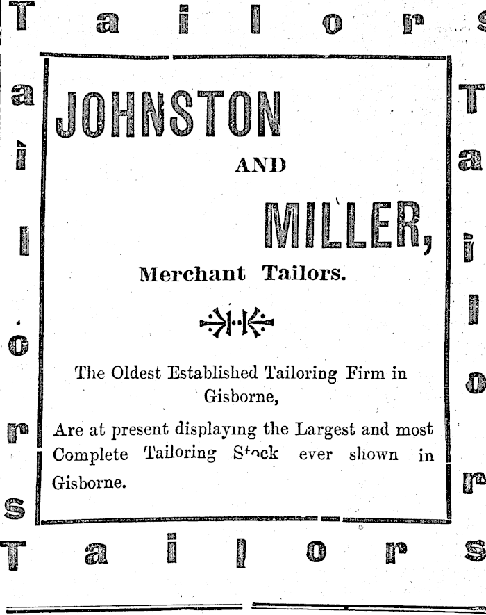 AND 1 Merchant Tailors. The Oldest Established Tailoring Firm in Gisborne, Are at present displaying the Largest and most Complete Tailoring S ever shown in Gisborne.