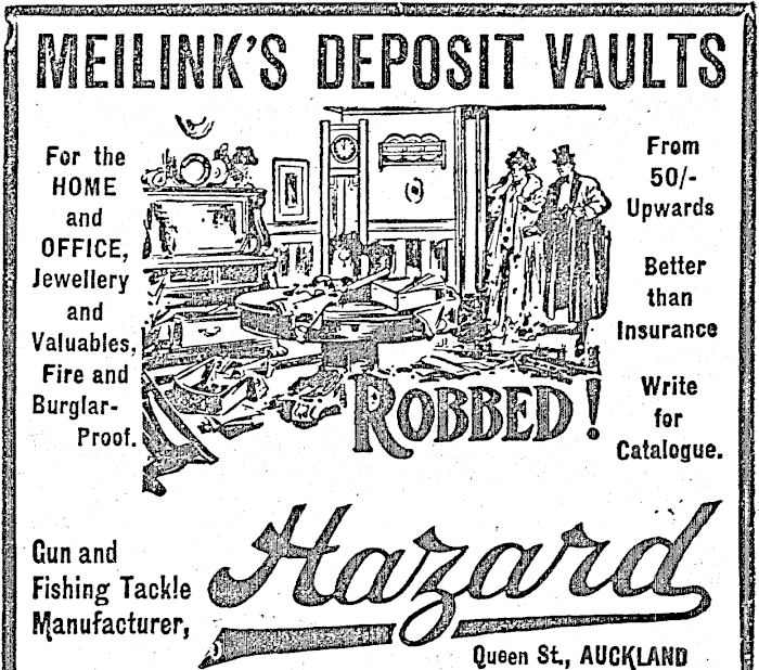 9 For the n HOME $ and OFFICE, Jewellery and Valuables, Fire and BurglarProof. Gun and Fishing Tackle Manufacturer, 2 -msmmmmi From 50/Upwards Better than Insurance Write for Catalogue. Queen St, AUCKLAND