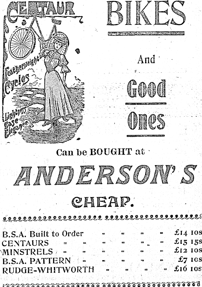 m 's m e® 11 BIKES And' ■t , ... fttf Can be BOUGHT at ANDERSON’S @HEHR B.S.A. Built to Order CENTAURS MINSTRELS « B.S.A. PATTERN - RUDGE-WHITWORTH £l4 10s £ls 15s £l2 ios £7 lOS £l6 lOS 'rsVrrr^wrrrrrrrir^