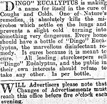 BINGO” EUCALYPTUS is making a name for itself in the cnre of Coughs and Colds. One of Nature’s remedies, it absolutely kills the microbes which settle on the lungs and prevents a slight cold turning into something very dangerous. Every home should have a bottle of “Dingo” Eucalyptus, the marvellous disinfectant remedy. It cures because it is meant tc cure. All leading storekeepers sell “Dingo” Eucalyptus, and the public in their own interests should refuse to take any other. Is per bottle. Y&7ILL Advertisers please note that VV Changes of Advertisements must reach this office before e-’clook each evening.
